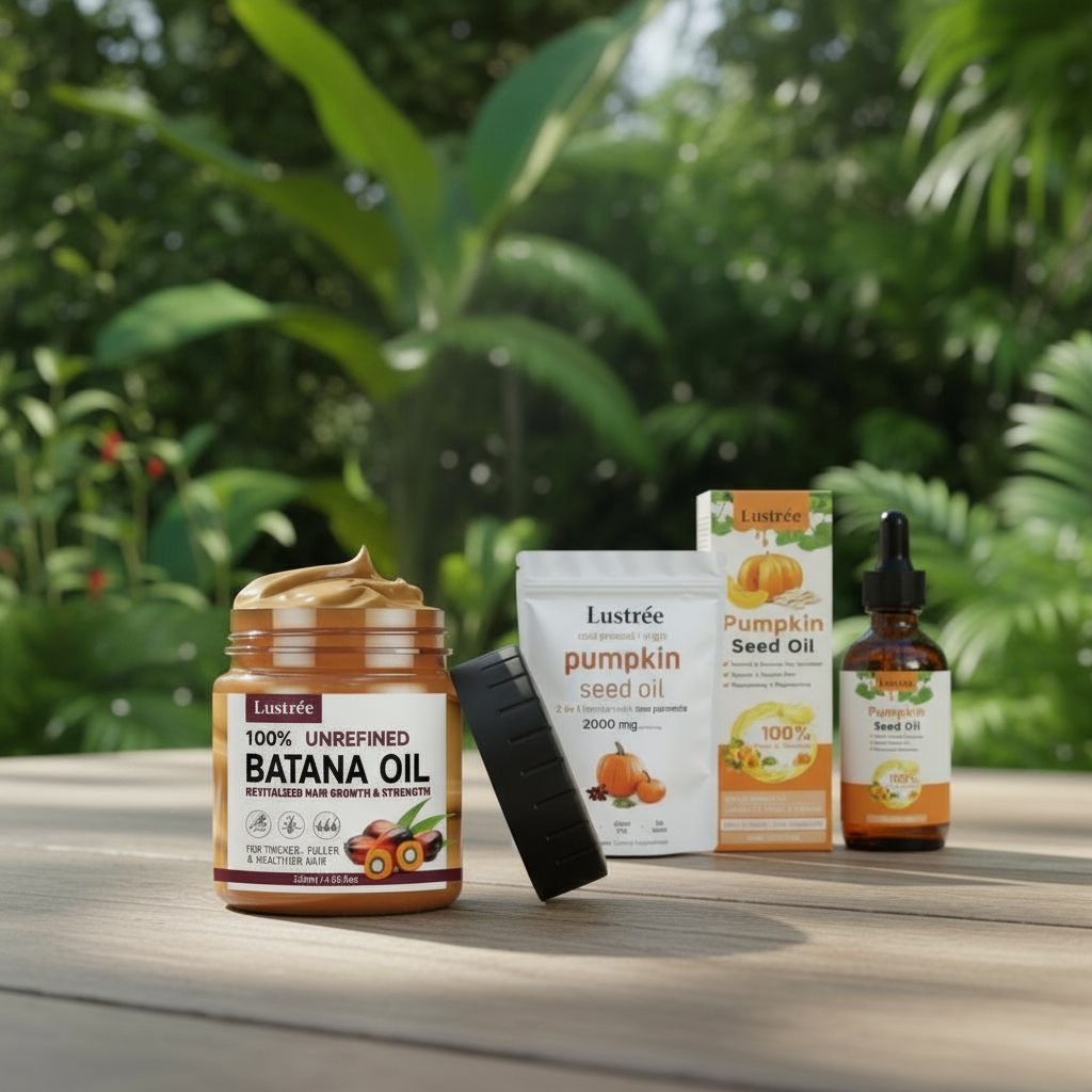 Lustrée products, like pumpkin seed oil and batana oil, are made to help stop hair loss and make your hair stronger so it breaks less.